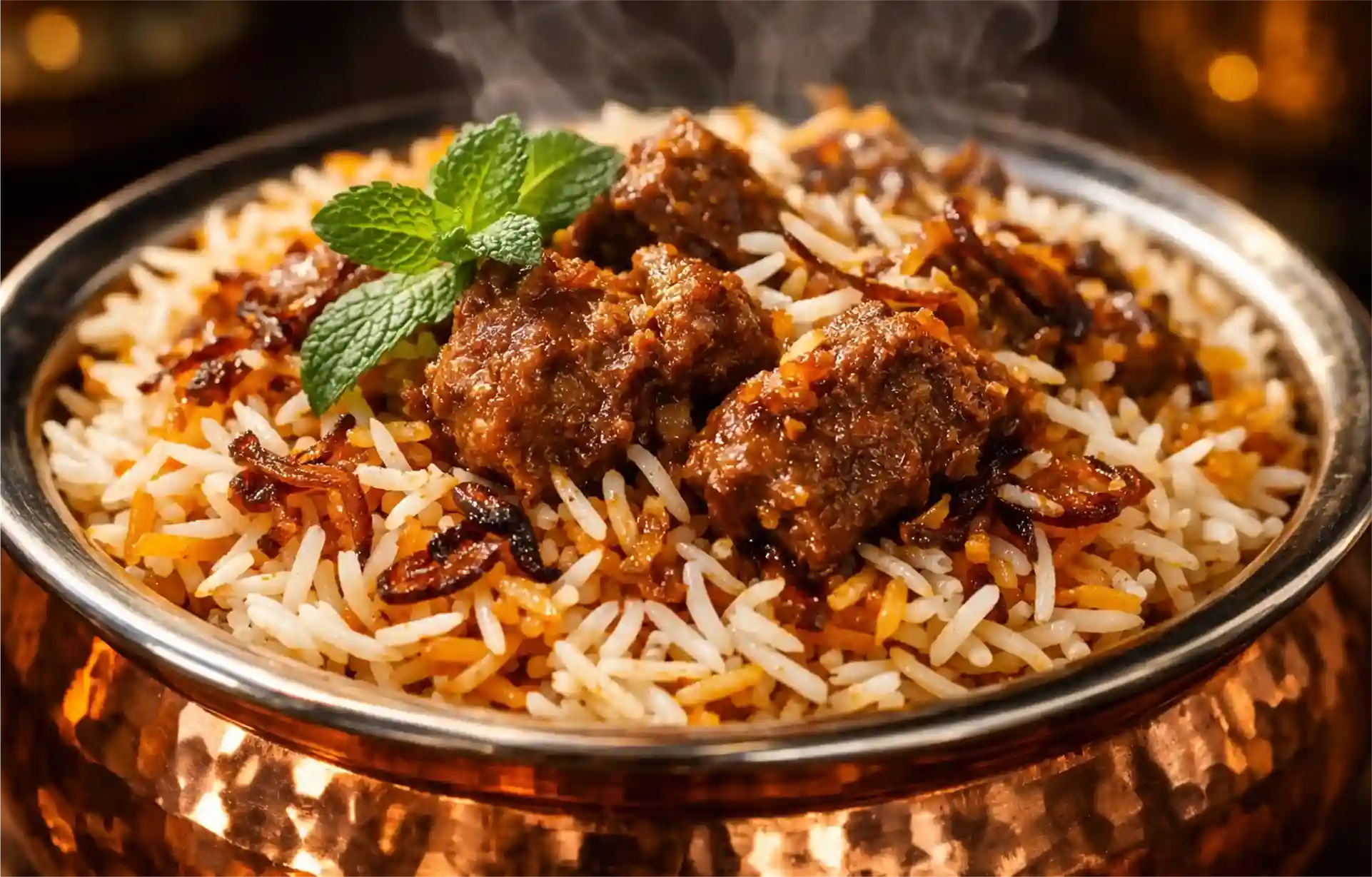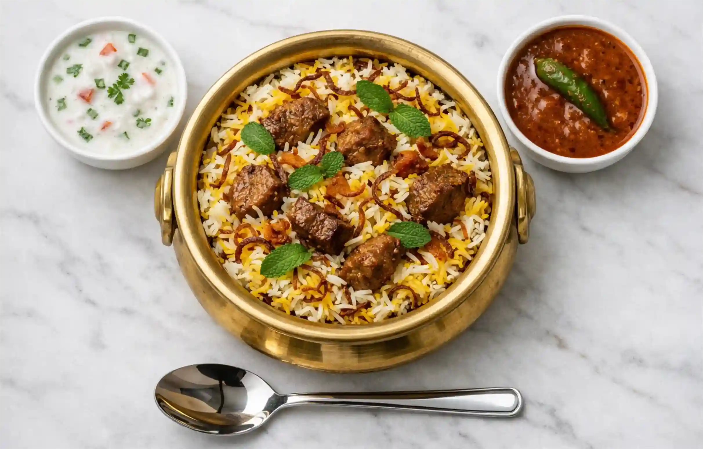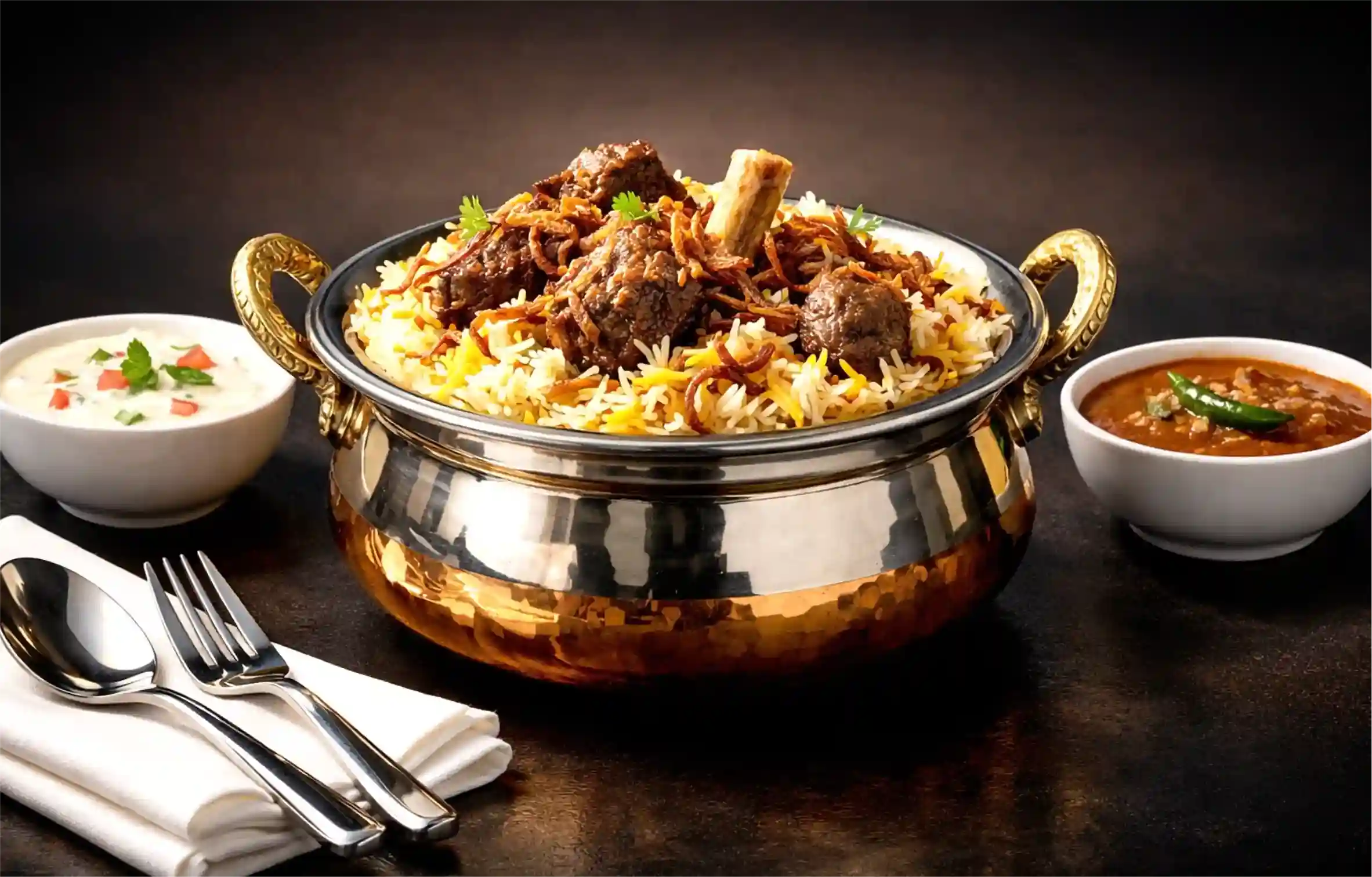 Mutton Dum Biryani is an aromatic dish. In its preparation soft pieces of mutton are marinated in yogurt with some spices and herbs. The meat is layered carefully with basmati rice and it is sealed. The addition of saffron and fresh coriander enhance its taste. It is enjoyed with raita.