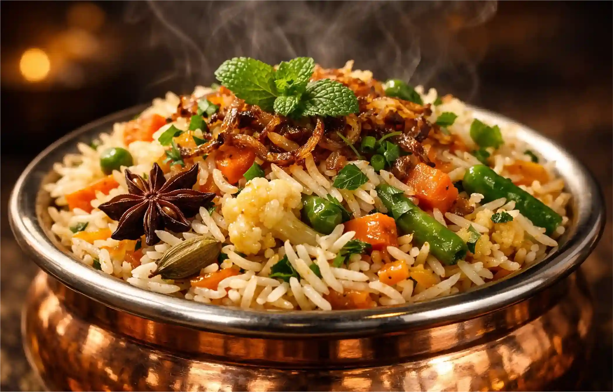 In the preparation of Veg Biryani basmati rice and a variety of vegetables are crucial. The addition of carrots, peas, beans, potatoes and onions enhance its taste. The rice and vegetables are arranged in layers and it is cooked on a slow flame. Fried onions, and fresh herbs enhance its taste. It can be enjoyed with raita or curry.